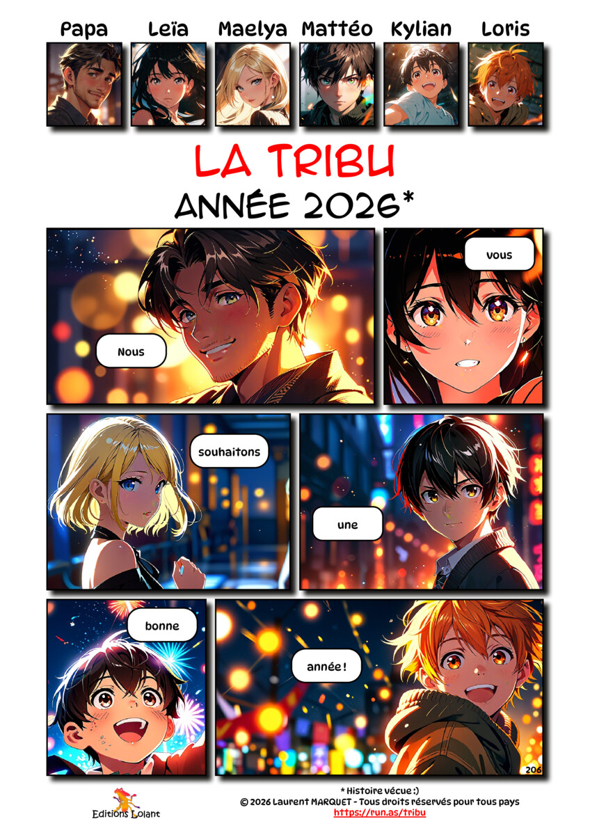La Tribu - Année 2026 Case 1 - Papa : Nous Case 2 - Leïa : vous Case 3 - Maelya : souhaitons Case 4 - Mattéo : une Case 5 - Kylian : bonne Case 6 - Loris : année !