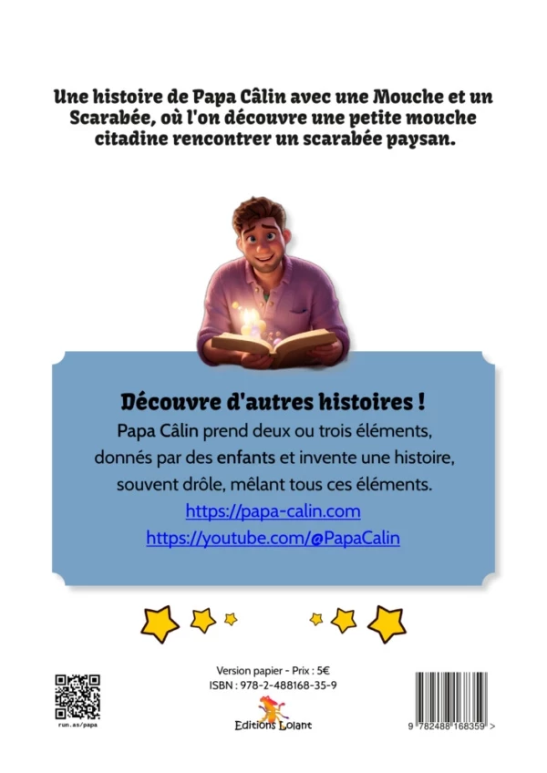 Une histoire de Papa Câlin avec une Mouche et un Scarabée, où l'on découvre une petite mouche citadine rencontrer un scarabée paysan.