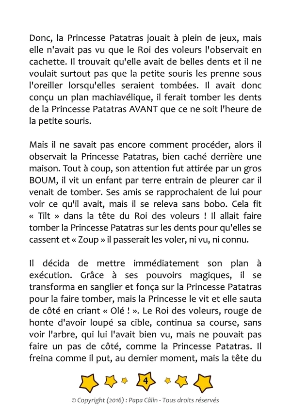 Une histoire de Papa Câlin avec la Princesse Patatras et le Roi des voleurs, où l'on découvre comment le Roi des voleurs est prêt à tout pour avoir une dent.