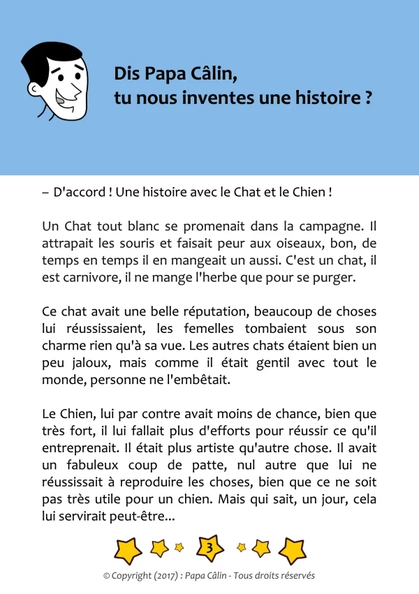 Papa Câlin prend deux ou trois éléments, donnés par des enfants et invente une histoire, souvent drôle, mêlant ces éléments.