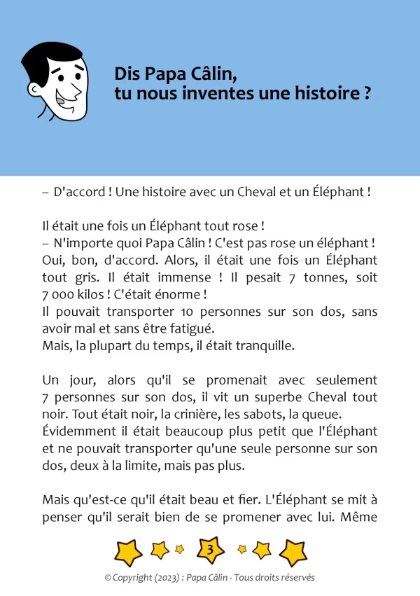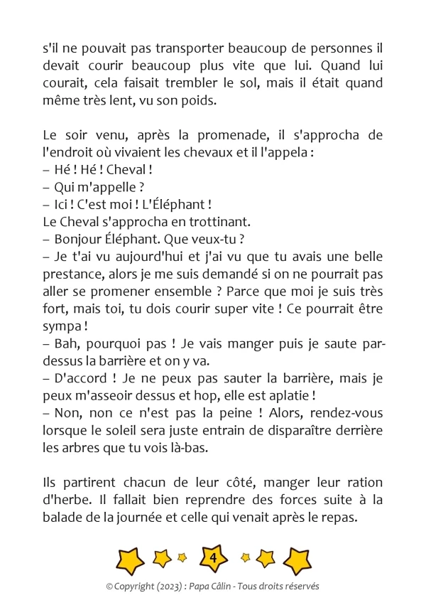 Une histoire de Papa Câlin avec le Cheval et l'Éléphant où l'on découvre que deux animaux totalement différents peuvent devenir amis.
