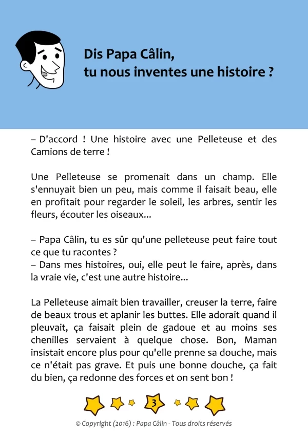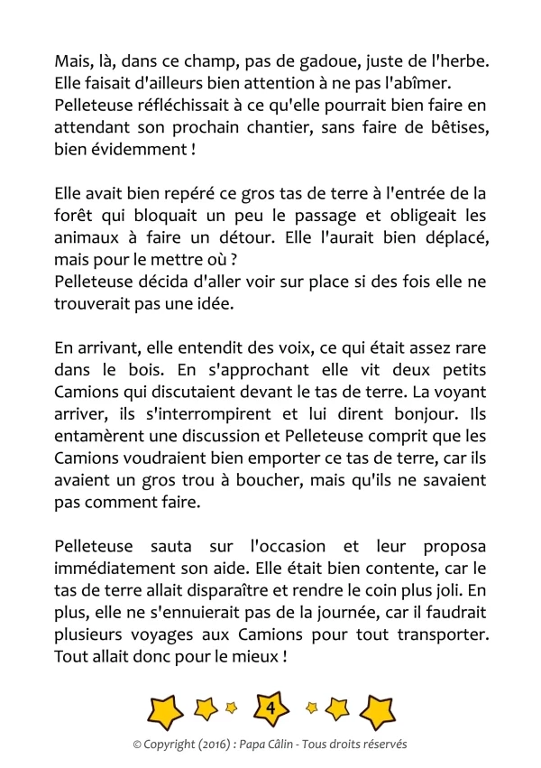 Une histoire de Papa Câlin avec la Pelleteuse et les camions de terre, où l'on découvre que l'entraide peut mener à de belles choses.