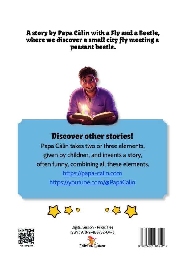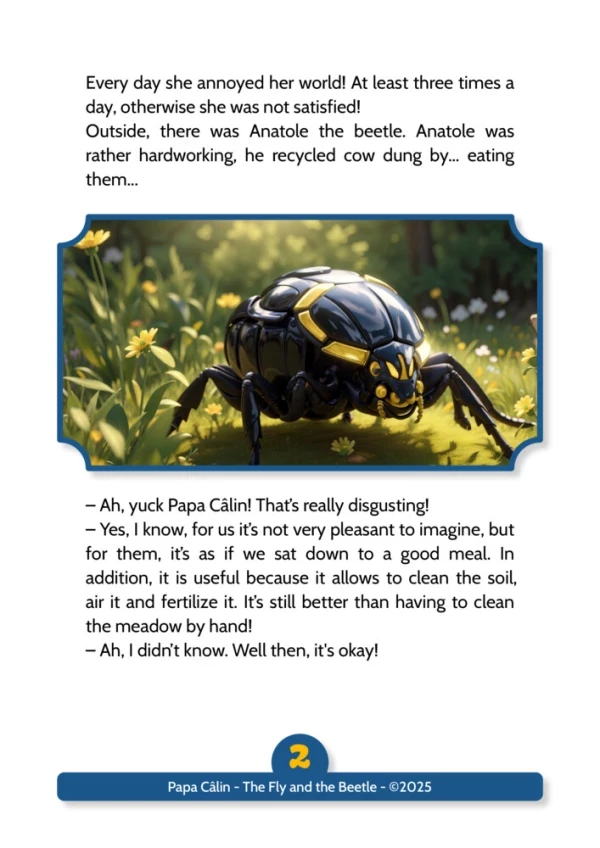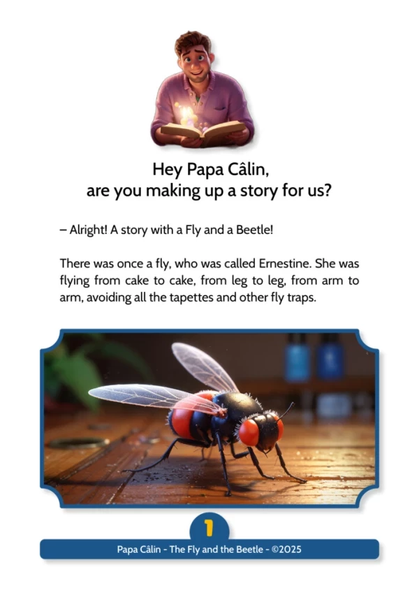 A story by Papa Câlin with a Fly and a Beetle, where we discover a small city fly meeting a peasant beetle.