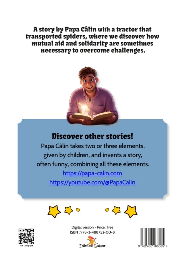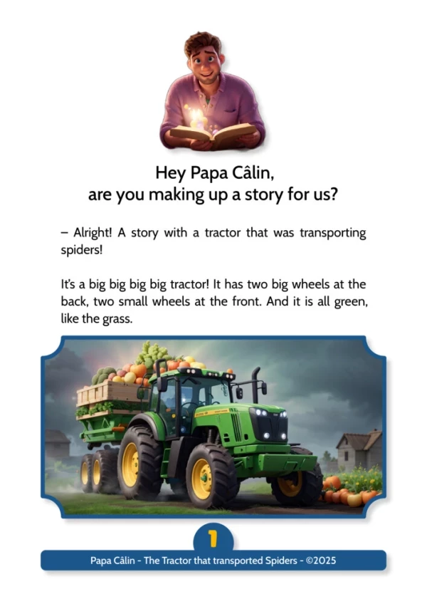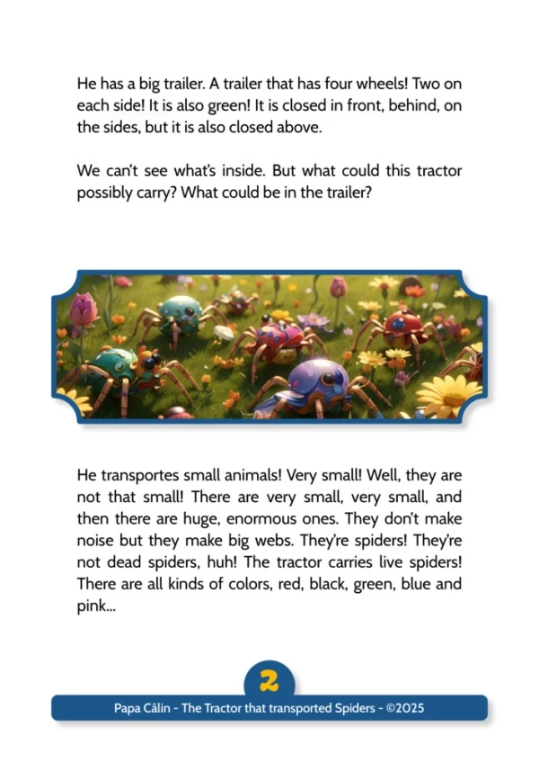 A story by Papa Câlin with a tractor that transported spiders, where we discover how mutual aid and solidarity are sometimes necessary to overcome challenges.