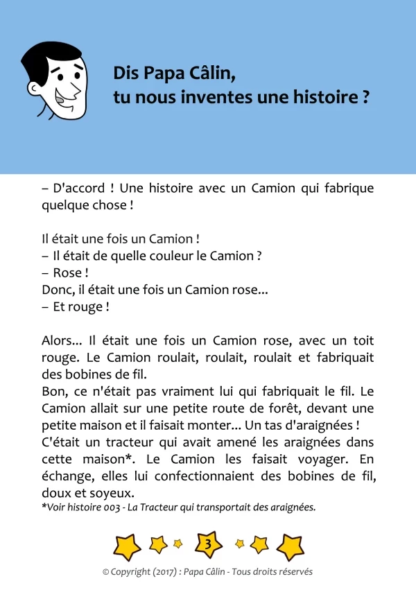 Papa Câlin prend deux ou trois éléments, donnés par des enfants et invente une histoire, souvent drôle, mêlant ces éléments.