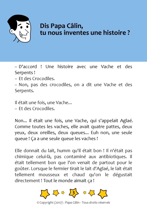 Papa Câlin prend deux ou trois éléments, donnés par des enfants et invente une histoire, souvent drôle, mêlant ces éléments.